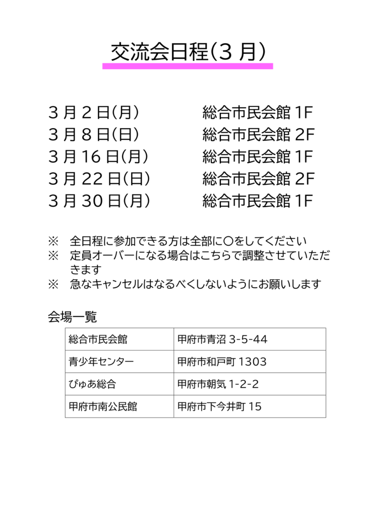 2026年3月 交流会日程のお知らせ 2026 1/26 交流会 2026年1月26日 ※定員オーバーになる場合は調整させていただきます。※急なキャンセルはなるべくしないよう、ご協力をお願いいたします。 交流会に参加希望の方は、以下のページで交流会の料金やルールなどをご確認のうえ、お申し込みください。 \ 詳細は / こちらから 交流会 交流会 よかったらシェアしてね! URLをコピーしました! URLをコピーしました!