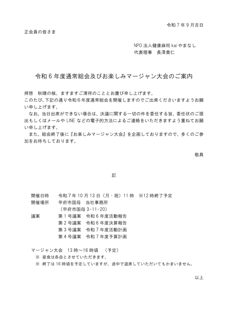 【正会員の皆様へ】令和6年度通常総会及びお楽しみ麻雀大会のご案内